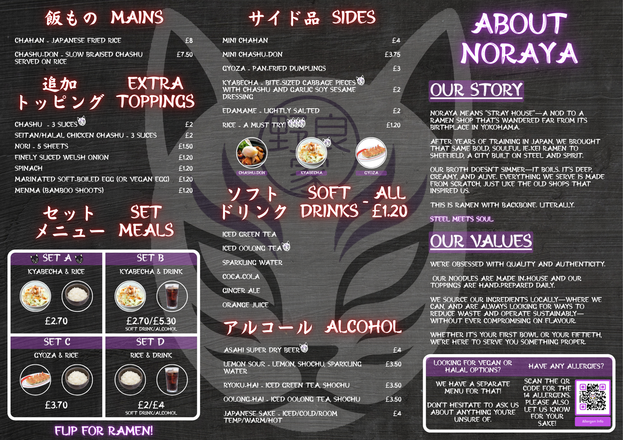 The name Noraya (野良家) means “the stray house” — a nod to the wandering spirit of our shop and the long journey it’s taken to find a home in Sheffield. We didn’t reinvent anything. We just wanted to bring something real — the kind of ramen you’d find in a backstreet shop in Yokohama — and do it right.